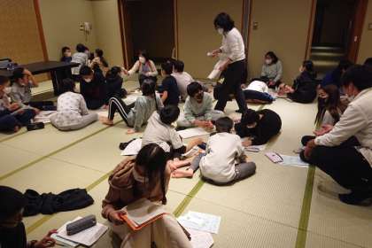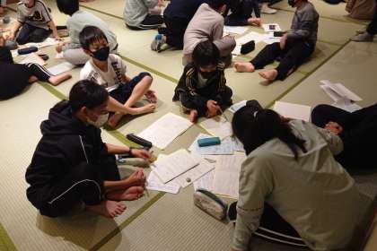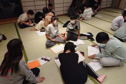 語り部さんのお話の後、グループで、平和学習のまとめをしています。