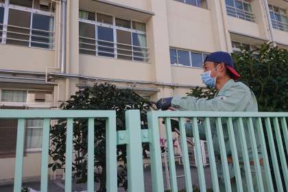 本校の管理作業員は、正門付近の樹木の剪定をしています。
