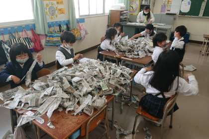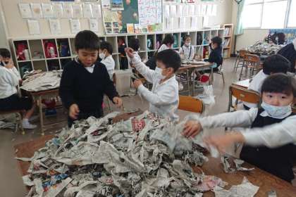 新聞紙を、はさみを使わずに切り取り、形を作っています。