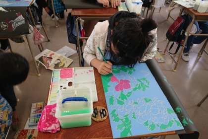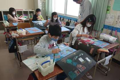 浮世絵を題材にして彫刻刀で版木を彫り、1色ずつ絵の具をつけて刷っていきます。