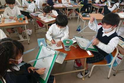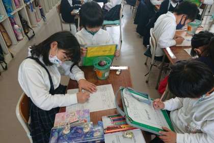 ヒアシンスを観察して、カードに絵と文でまとめています。