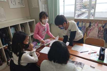 一人一人が調べたことを班で共有し、学級全体でまとめています。