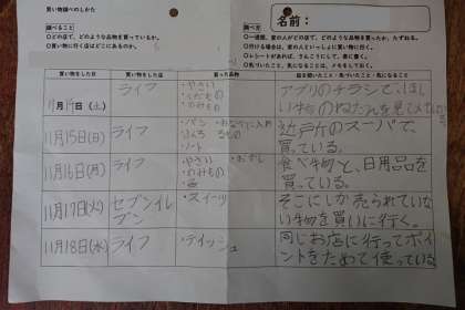 1週間、お家の人がどの店でどんな品物を買ったかたずねたり、一緒に買い物に行ったりして調べました。