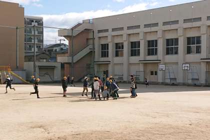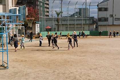 たくさんの子どもたちが運動場で元気に遊んでいます。