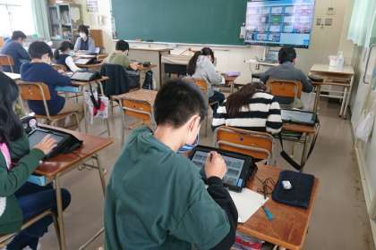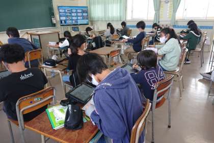 将来の自分の姿をイメージするために、自分がなりたい職業や、やりたいことを、実際にしている人やその仕事のようすなどをタブレットで調べています。