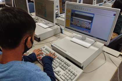 パソコン室で、ローマ字でキーボードのタイピングの練習をしています。