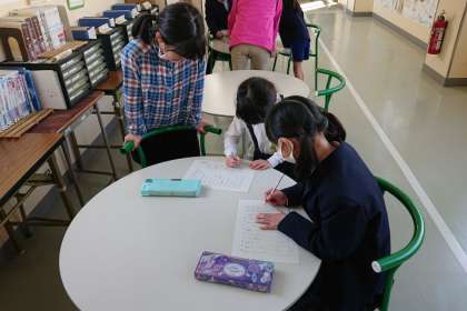昼休みに、2階の「漢字のコーナー」で自主的に漢字の学習をする子どもたちがいました。