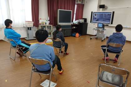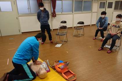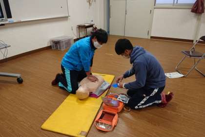 DVDを見たり、模型を使ったりして、心肺蘇生法やAEDの使い方などの救命措置について学びました。