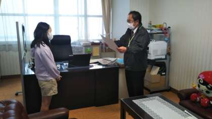 まず、5年生の児童が防災図画の表彰を受けたので、校長室で表彰状を渡しました。