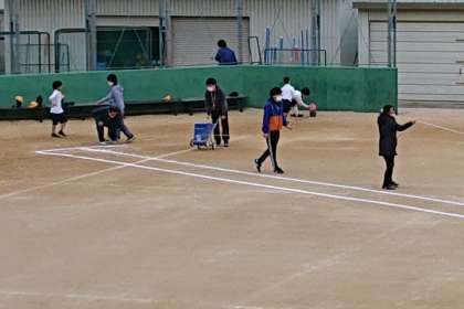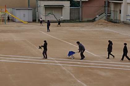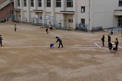 放課後、教職員で体力テストの「50m走」のライン引きをしました。