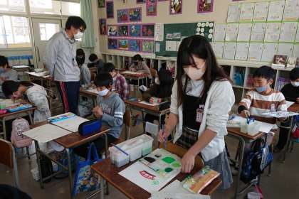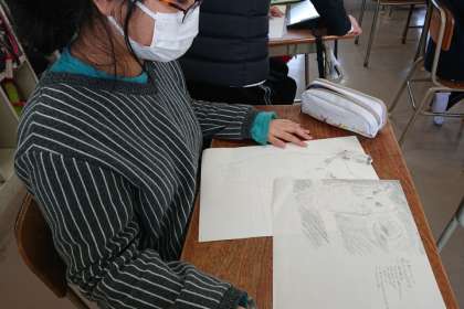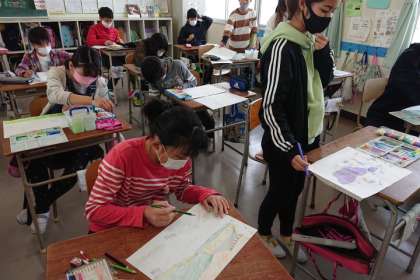 「こどもエコ絵画コンクール」に出展する作品を描いています。