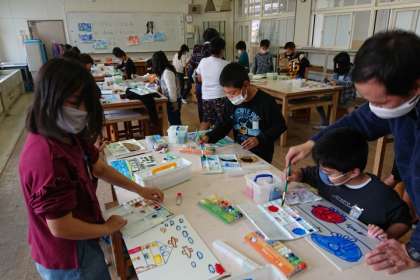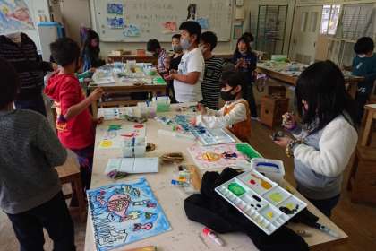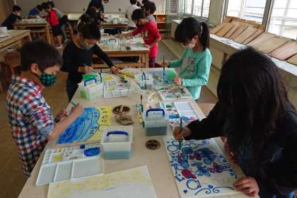 下絵が完成し、実際に絵具をつけて、用紙に転写します。