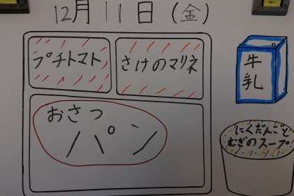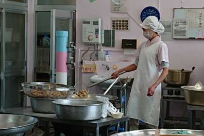 給食調理員が、たくさんの鮭の切り身を揚げています。