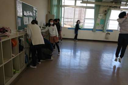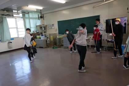 机・いすを廊下に出して、教室のすみずみまできれいにしています。