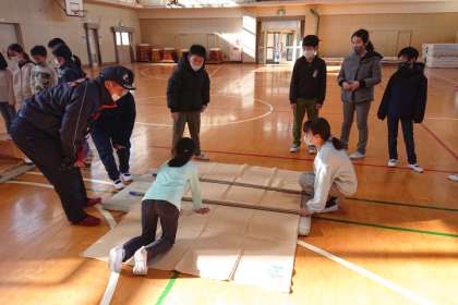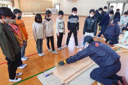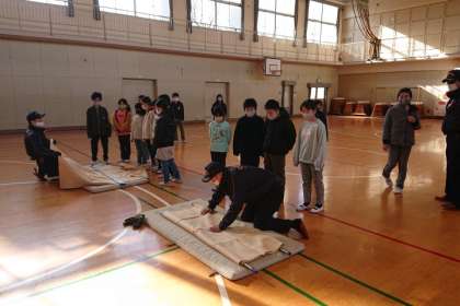 講堂では、緊急時の担架のつくり方について消防署の方に教えていただきました。