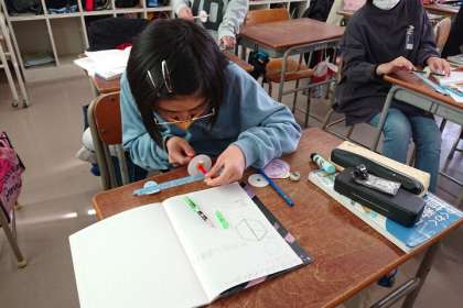 教科書に付いている「円周測定マシーン」を作り、それを使って円周の長さを測ります。