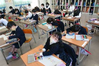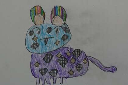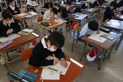 子どもたちが「せかいいち きれいな ふしぎな いきもの」を考え、下書きを描いています。