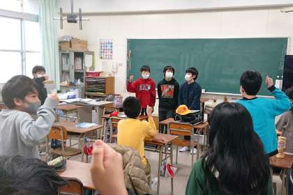 集会委員が、落ちてくるものを言うので、言われた言葉に合わせて、すばやくポーズをとるというゲームです。