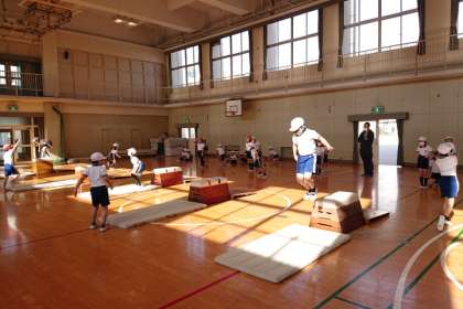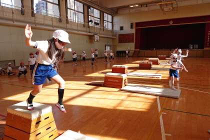 片足で踏み切って、跳び箱に跳び乗ったり、ジャンプして跳びおりたりする運動です。