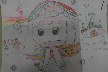 子どもたちが「せかいで いちばん ふしぎで きれいな○○」を考え、下書きを描いています。