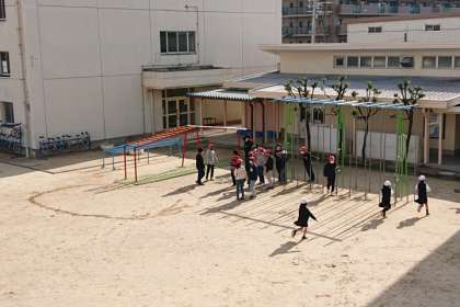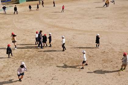 あたたかな日差しの中、たくさんの子どもたちが外遊びをしています。