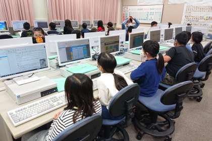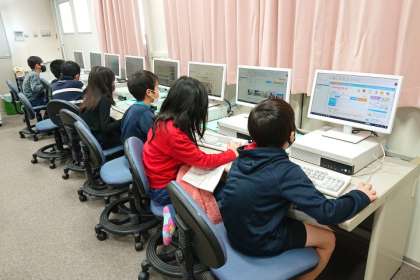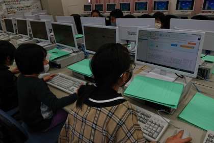 子どもたちが、自分のテーマをもとにインターネットで調べています。