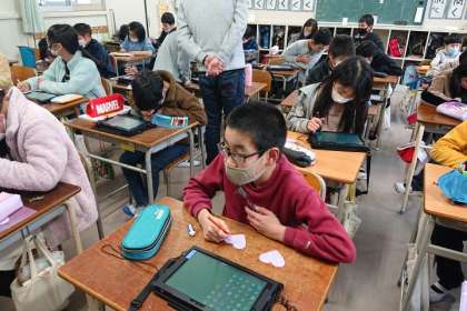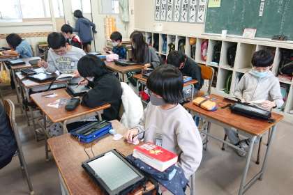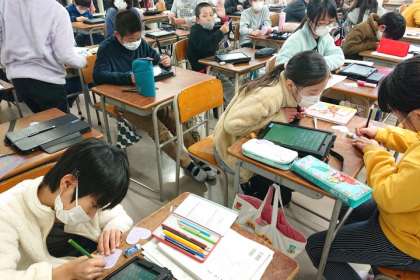 5年生が、3月に卒業する6年生へのメッセージカードを書いていました。