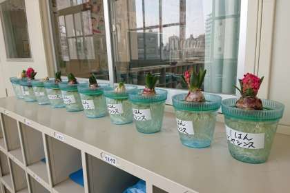 1年生の教室の前で育てているヒアシンスの水栽培。