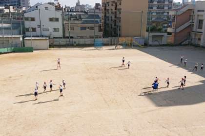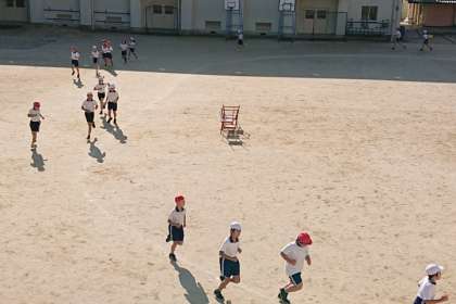 かけ足で体をあたため、なわとびの練習をした後、コートに分かれポートボールをしています。