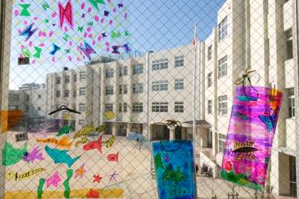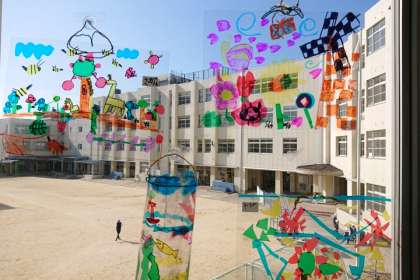 2年生の教室近くの窓には、光をとおすカラフルな作品が並んでいます。