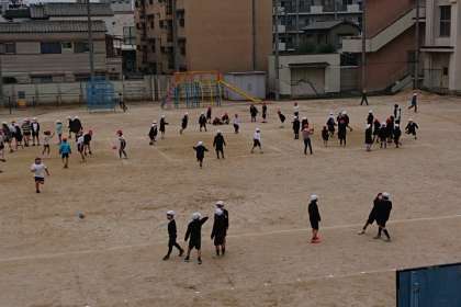 たてわり班のメンバーが集まり、6年生にプレゼントする色紙の写真を撮影しています。