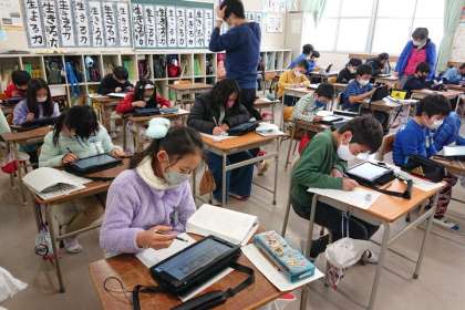 タブレットを使って、自分で決めたテーマについて調べています。
