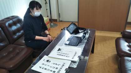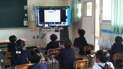 今日の朝会は、校長室と各教室を結び、オンラインで行いました。