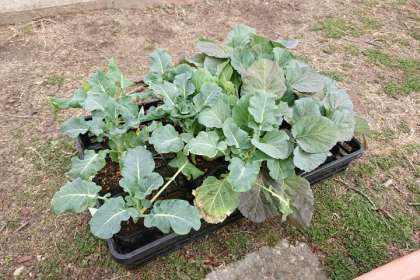 2年生の子どもたちが教室に戻ったあと、担任と管理作業員が、5時間目にキャベツとブロッコリーを植える準備をしています。