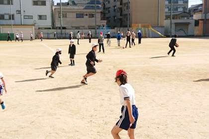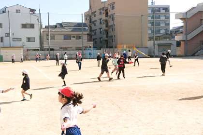 たくさんの子どもたちが運動場に出ています。