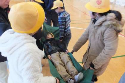 布担架で人を運ぶ訓練では、声かけをしながら丁寧に運ぶことができました。