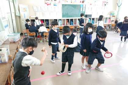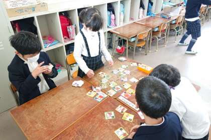 子どもたちは、昔から伝わる、「お手玉」「かるた」「けん玉」「羽子板」「こま」「だるまおとし」の遊びを楽しんでいます。