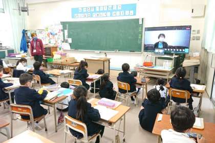 各教室と校長室をオンラインで結び、児童朝会を行いました。