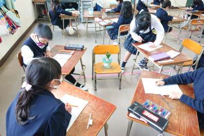 子どもたちが一生懸命観察して、気づいたことを絵と文でカードにまとめています。