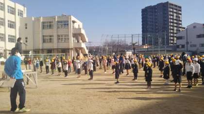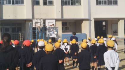 今日は暖かい朝なので、運動場で朝会を行いました。