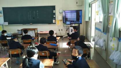 今日の児童朝会は、校長室と各教室をオンラインで結んで行いました。