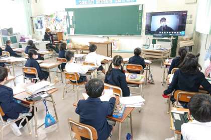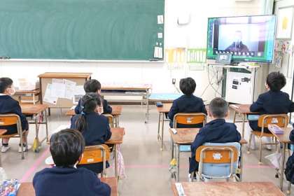 今日の児童朝会は、校長室と各教室をオンラインで結んで行いました。