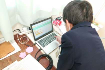 パソコンを使って、学習後の「心の天気」を入力しています。