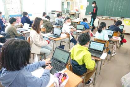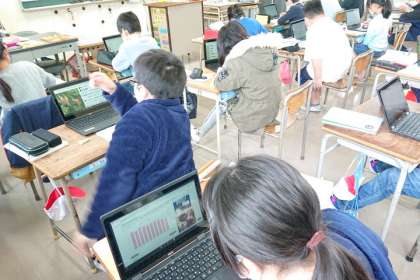 1人1台の端末を使って、インターネットで大阪の特産物について調べています。