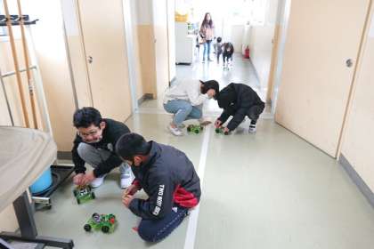 モーターカーを組み立て、廊下で走らせています。