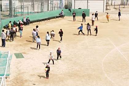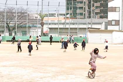 たくさんの子どもたちが外遊びをしています。