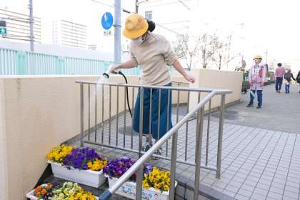 飼育栽培委員会の6年生が正門近くの花の水やりをしています。
