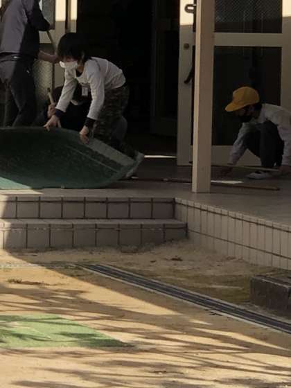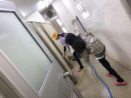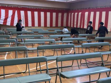 明日の卒業式に向けて、5年生が講堂や校舎1階などの掃除や準備を教職員と一緒に行いました。