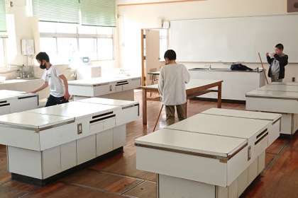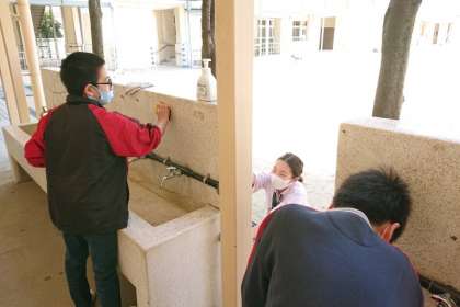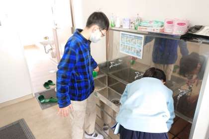 給食室前の手洗い場や、いきいき教室横のトイレ、家庭科室など、一生懸命掃除しています。