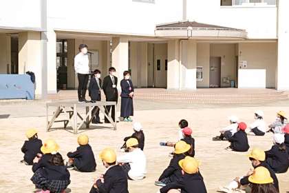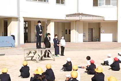 今年度いっぱいで歌島小学校を離れる教職員が、子どもたちに離任のあいさつをしました。